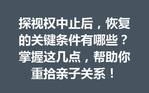 文章目录▼CloseOpen 探视权中止的原因主要有哪些? 如何评估自己是否具备恢复探视权的条件…